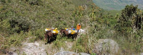 Sobre las 6:30 Antonio, David, Piru y Nitu preparan y cargan los petates en dos caballos de Pedro. Desayunan y salen hacia la zona de Shungaya, conocida como el Arenal, con el propósito de abrir la parte alta del barranco de Palomita.