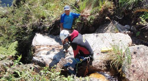 Dos horas de aproximación los dejan en la cabecera. Se toman la comida que llevan preparada en un taper, porque si la menten en el barranco se va a mojar. Se equipan y entran en el barranco, directamente en el primer resalte. Pedro observa como montan la cabecera y como bajan. Tras unos pequeños rápeles llegan a un gran salto de unos 90 m., que lo fraccionan en dos.