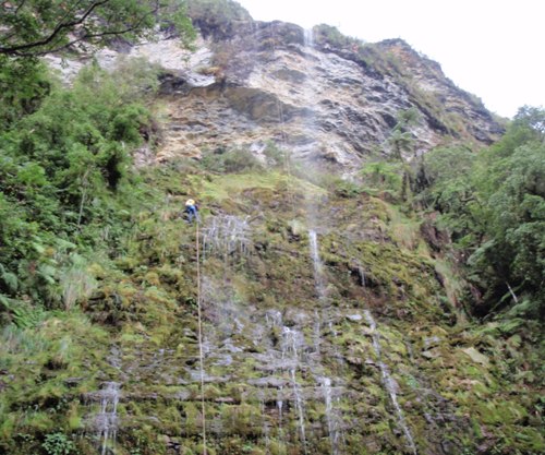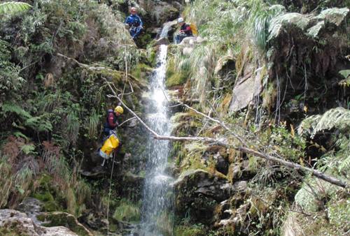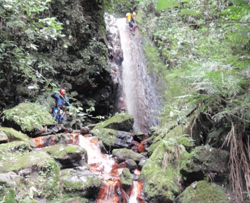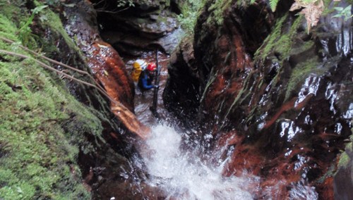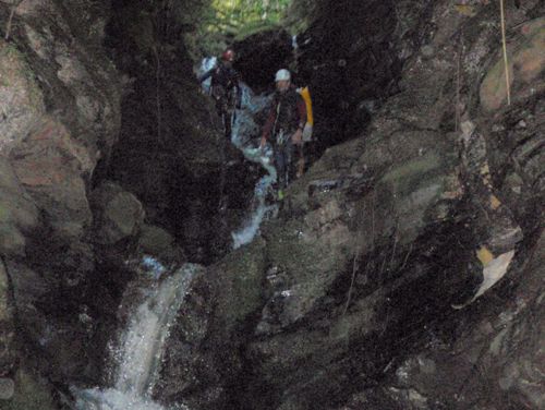 Después el barranco se cierra y gana en ambiente, aguas ferruginosas y muy estrecho, sucesión de muchos rápeles pequeños hasta encontrar un camino que cruza el rio de izquierda a derecha, que lleva hasta unas chacras.