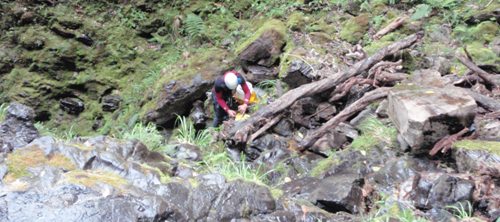 Otro grupo, Josema, Marisa, Xavi, Juan, José y Rodrigo se acercan a golpe de machete a la cabecera del barranco de Mata, pero la falta de longitud en las cuerdas que llevan y la meteorología les hace dar media vuelta y volver al campamento.