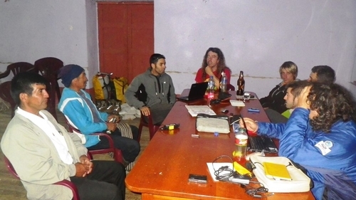 Por la tarde, con el grupo de exploración de vuelta y el colegio desmontado, ofrecemos un taller de orientación-capacitación para los guías turísticos de la municipalidad de Cuispes. Al taller acuden Marcial y sus hermanos Victor y Ilton, nosotros les orientamos de las necesidades que tienen los grupos que quieran realizar los descensos abiertos y de las posibilidades que ofrece la zona para atraer turistas, todo lo demás ya lo saben, son expertos guías y conocedores de la zona, si saben ofrecerse al turismo tendrán una fuente de ingresos que les ayudará mucho para tirar adelante a sus familias.
