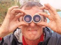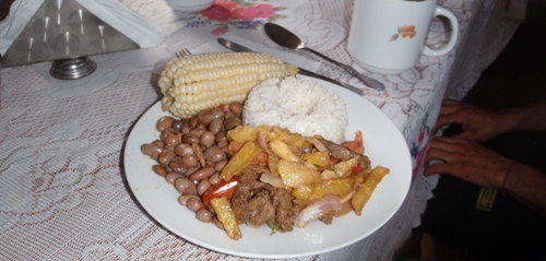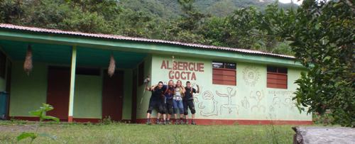 Al volver, Juan se une a Marisa, Xavi y Jesús, que se acercan a la base de la cascada Gocta para estudiar la mejor línea de descenso. Pasan junto al Albergue de Gocta, que era donde en principio nos ibamos a alojar.