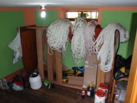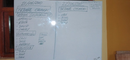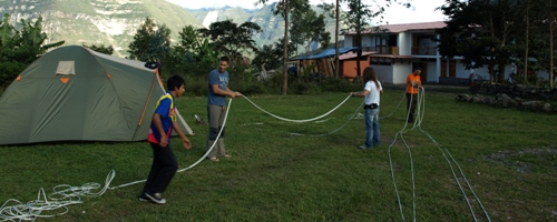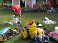 Hemos decidido atacar mañana Golondrina Superior. Amancio, Kata, David y Charly subirán a Shungaya y pernoctarán allí con la intención de atacar este barranco. A lo largo de la mañana preparan el material para dormir y equipar el barranco. Se corta una cuerda de 240 en dos piezas de 120, y se marca un 200.