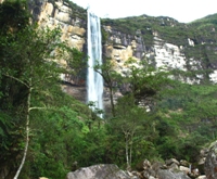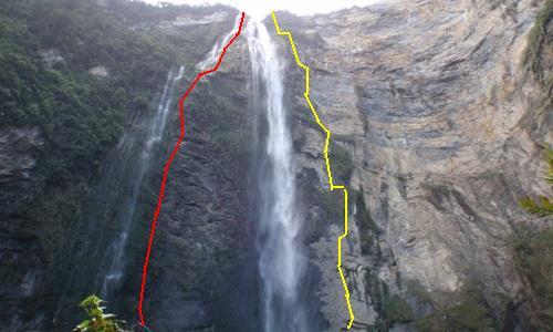 La línea que habíamos planeado viendo las fotos en España (a la derecha del chorro), en el terreno muestra sus verdaderas dificultades. Es demasiado desplomada, por ahí nos va a ser imposible llegar a la pared con péndulos. Jesús propone bajar por la izquierda, que aún siendo vertical tiene algunas rampas y repisas. Esta linea tiene el riesgo de que hay tormenta… en una hora Gocta puede crecer y esta línea puede hacerse difícil e incluso peligrosa. Habría que improvisar un vivac hacia el lateral de la pared.