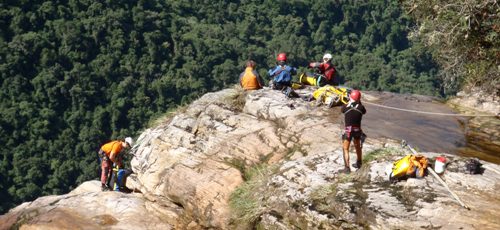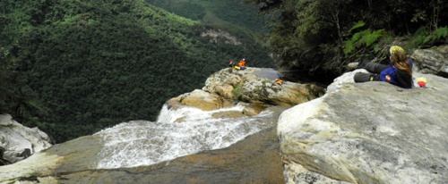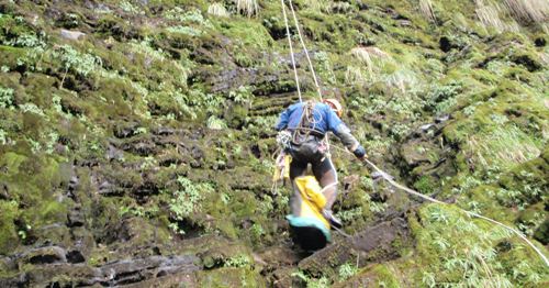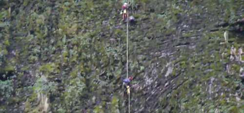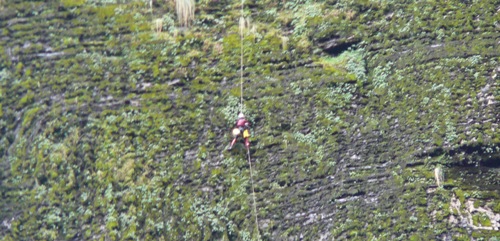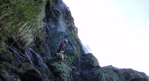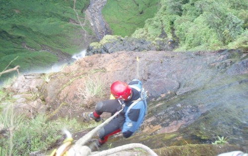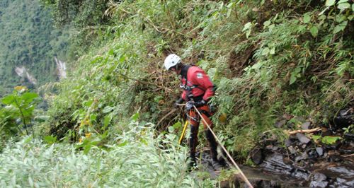 Nitu sigue hasta la base de la cascada y allí establece un perímetro de seguridad para que los turistas no se acerquen a la poza por el peligro de caída de piedras. Desde esta posición guiará la línea de descenso al equipo de ataque.