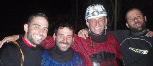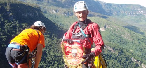 Nos fundimos en un abrazo y se ayuda a recuperar las cuerdas y el material. Se aligera de peso al equipo de descenso y se hacen fotografías con los logos de los patrocinadores.