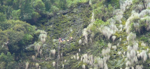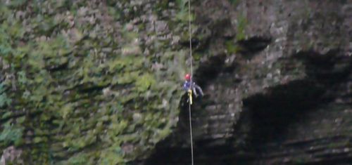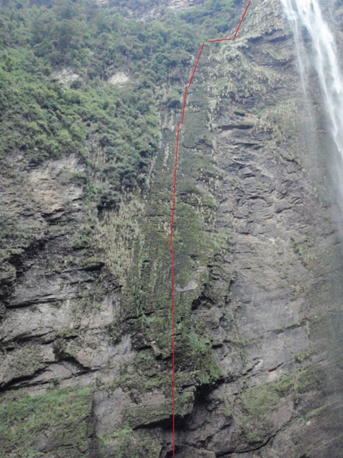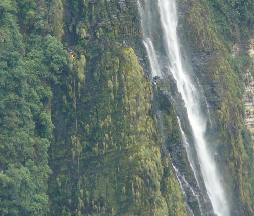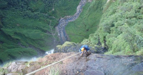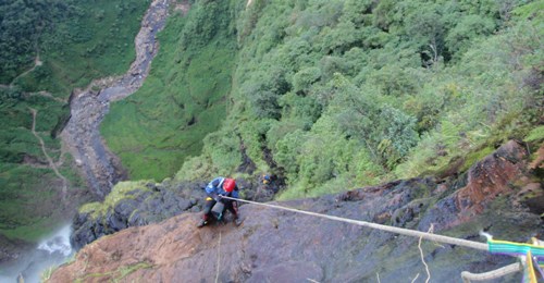 Descenso de Gocta inferior: Pasamanos 50, R80, R90, flanqueo (R10 + R15 ), R25, R40, R60, R95, R140.