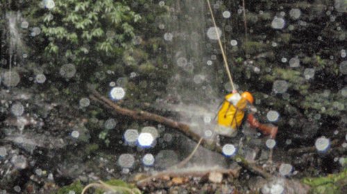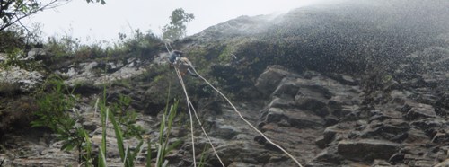 Van instalando rápeles y cuando están a punto de conectar con los estrechos de Escalón empieza a tronar y llover con fuerza, una gran tormenta afecta a todas las cabeceras. Nitu y Antonio baja un rapel más para instalarlo. Y Antonio baja otro más para ver lo que queda para unir al Escalón. A esto que truena fuerte, encima de nosotros... y JoseMa empieza a gritar.... !!! Nitu, que viene la crecida !!!