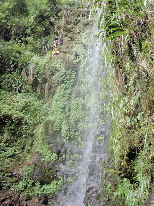 Antonio, Josema y Nitu, que son los que quedan operativos en el poblado, conseguen salir a las 08:00 para abrir el barranco (con una hora y media de retraso sobre el horario previsto... esto es asi, es Peru, otro ritmo). Tras navegar un rato por una zona de selva y pelearse con algunos arbustos siguiendo los caminos de las vacas bravas, llegan a la cabecera a las 11:00.
