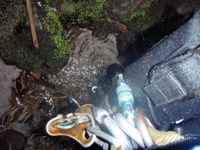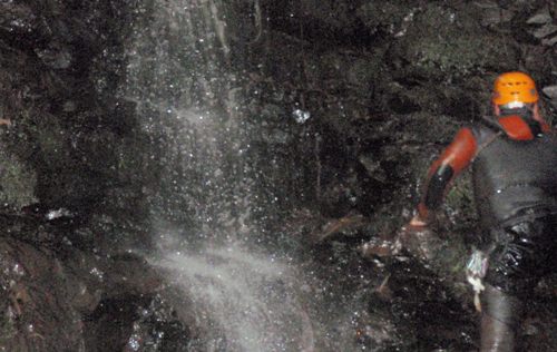 Nitu, asutado por las voces de JoseMa, remonta el rapel más rapido que los monos... a pulso (ni yumar, ni na...). Y los dos empiezan a gritar !!! Antonio, dejalo ya y sube rápido !!!... Pero Antonio, con más sangre fria, termina de equipar el último rapel y dejar asi instalado este afluente. Remonta y ve a los otros subidos por las paredes del cauce. !!! Que pasa? ...y la crecida? !!!. JoseMa le explica que se habia asutado con el trueno, la lluvia que habua arreciado de golpe y el vendaval que movía los árboles y pensaba que venía la crecida.